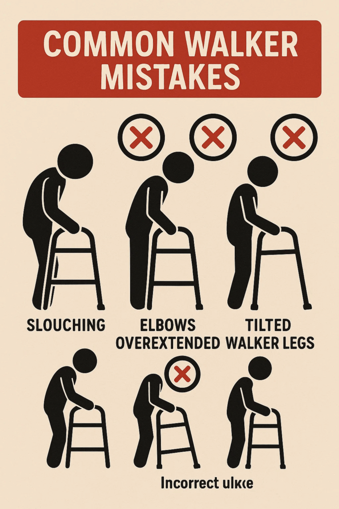 Unknowingly, a lot of users set their walker height based more on guesswork than on measurement. Setting the walker too high in the belief that it provides more support is a common mistake. In practice, this results in unsteady, uncomfortable walking patterns and shoulder fatigue. Similarly, lowering it too much makes one bend over, which raises the risk of falls and chronic back pain. Our blog post on how to use a Walker correctly addresses these posture-related mistakes.